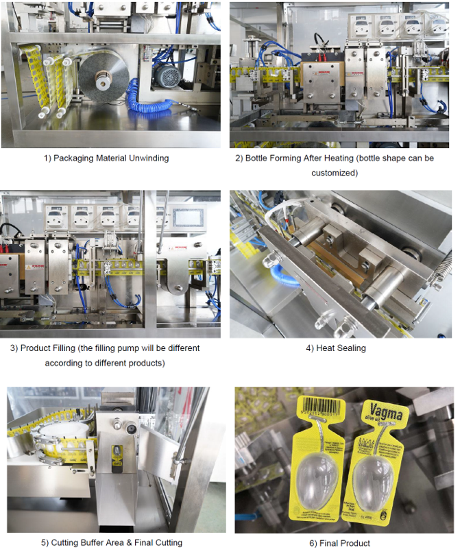 Compact machine, liquid filling and sealing machine, suitable for small batch filling for different product and widely used for filling oral liquid, perfume, liquid, essential oil, olive oil, syrup, fruit paste, health care product etc.