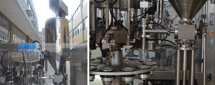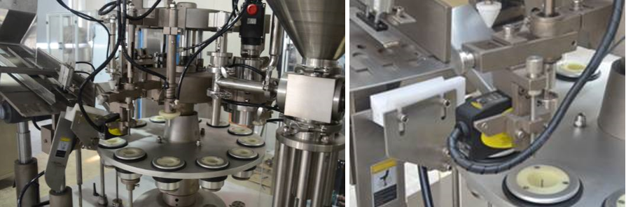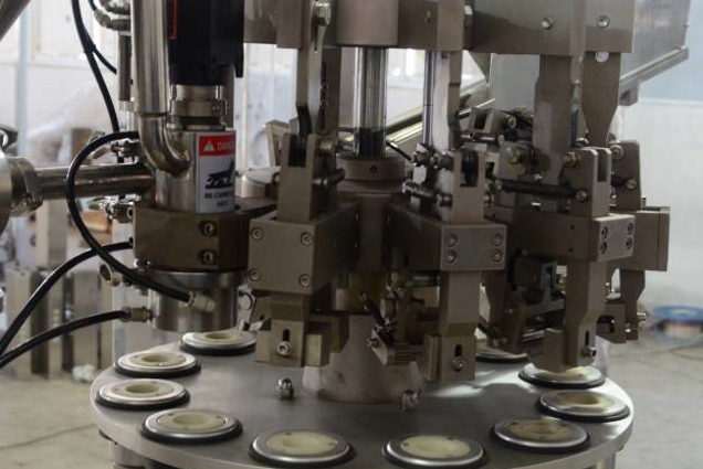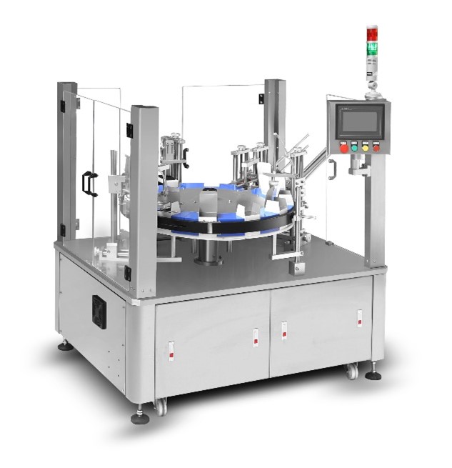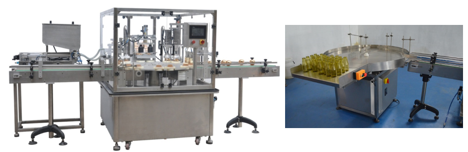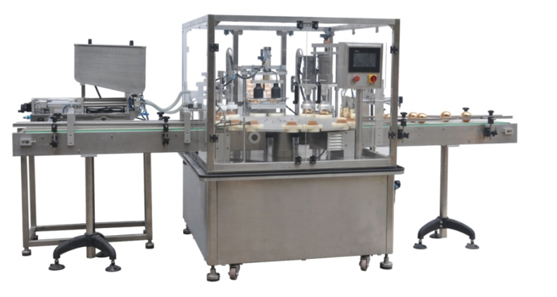 This equipment is integrated multi-station packaging equipment, and the stations include: filling (one head or double-heads), capping) and cap-pressing, cap-screwing.