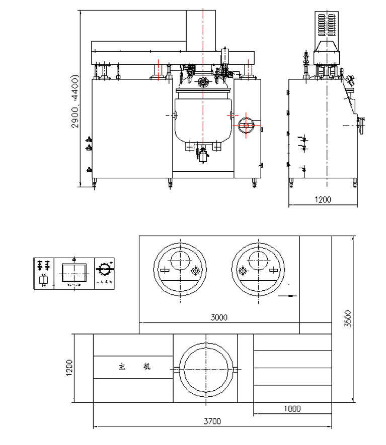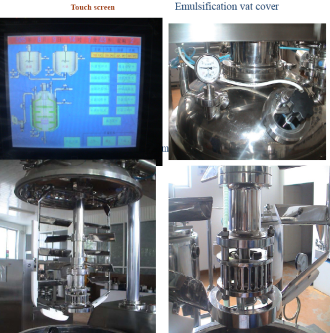 This unit applies upper coaxial triple type mixer and hydraulic lifting mode to open the cover. The speed of rapid homogenizing mixer is 0-3500 rpm (frequency control); the speed of slow-speed scraping mixer is 0-70 rpm (frequency control); the homogenizing head applies high cutting eddy current type emulsifying mixer. The slow-speed scraping mixer automatically abuts closely to the bottom and wall of boiler. By applying vacuum sucking, this unit can suck in powder material by using vacuum to avoid powder flying upward. The whole process is performed under the vacuum condition in order to keep from the production of air bubble after the material is mixed at high speed and up to hygienic asepsis requirement. This system is equipped with CIP cleaning equipment. The parts of container, which contact the material, are made of SUS316L stainless steel and inner surface mirror polish is up to 300MESH (sanitary level). In order to ensure stability of control part, the electric control parts apply the products from German Siemens, the press key from Japan FUJI Corp., frequency converter from Panasonic Electric Works, and vacuum pump from Siemens Corp.
