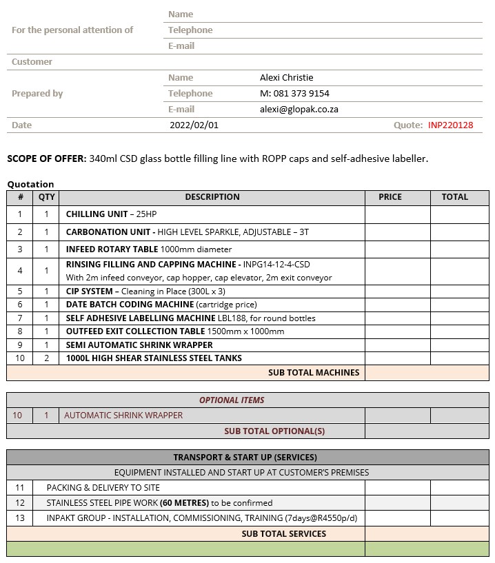 | Output Capacity | 2000-2500BPH on 340ml Glass Bottle |