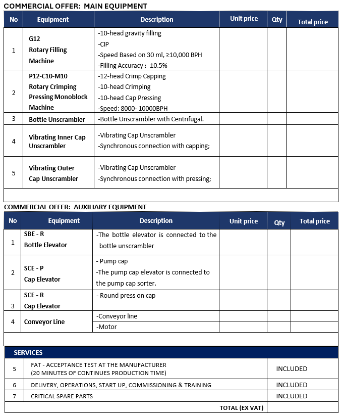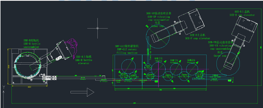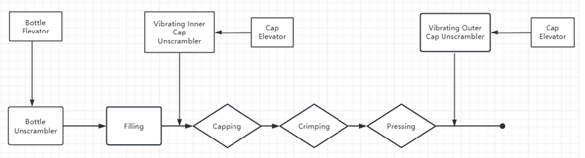 1. Line packaging: Bottle elevator, bottle unscrambler, filling machine, inner cap elevator, outer cap elevator, vibrating inner cap unscrambler, vibrating outer cap unscrambler, crimping and cap-pressing monoblock machine, conveyor line.