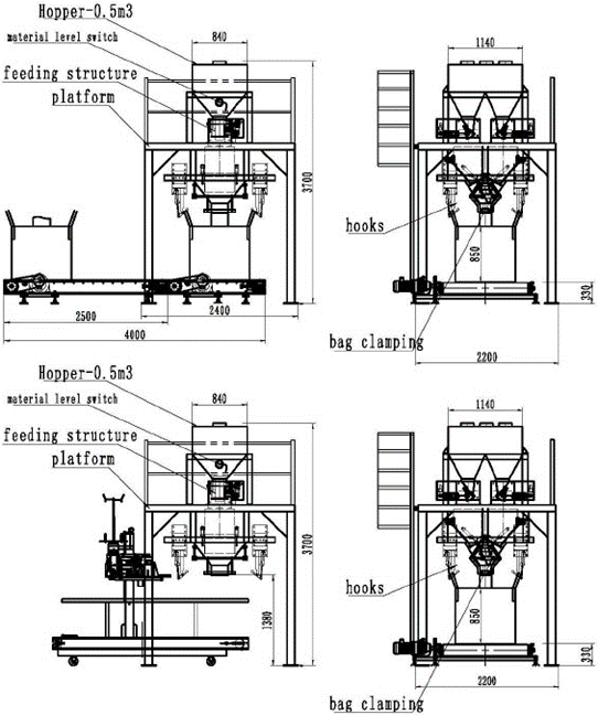 1000kg, 1500kg, 2000kg, etc. Its main components include the feeding mechanism, weighing mechanism, pneumatic actuators, rail section, bag folding section, dust-removing section, electric control system, etc.